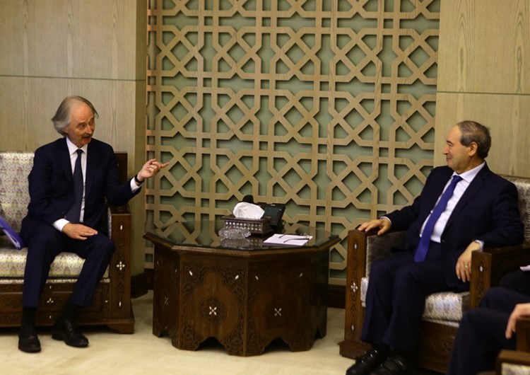 وزير الخارجية والمغتربين السوري فيصل المقداد والمبعوث الخاص للأمين العام للأمم المتحدة إلى سوريا غير بيدرسون، يبحثان في دمشق، مستجدات الوضع في سوريا.