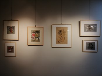 وفي المعرض أيضاً طفلة ترتدي ثياباً بيضاء وتحمل بيدها ثلاث وردات بيضاء على خلفية حمراء، وأطفال يَحْبُون مع حيواناتهم الأليفة، وآخرون يتأملون الأسماك والبطات على حافة النهر، وتحط على أكتافهم الحمامات، وفي عمل آخر هناك حصان يقف على قائمتيه الخلفيتين أمام نافورة ماء وبيديه سيف وترس…